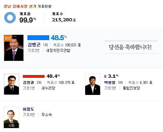 김해시장 선거결과, 0.1% 쫄깃한 차이네요", "
