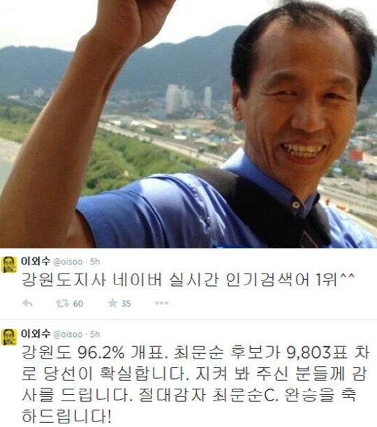 한편 최문순 당선자는 18대 총선에서 민주당 비례대표로 국회에 입성해 문화체육관광통신위원회 위원, 민주당 원내부대표, 유비쿼터스 위원장에 역임했으며, 2011년 4·27 재보궐 선거를 통해 제36대 강원도지사에 취임했다. <스포츠조선닷컴>