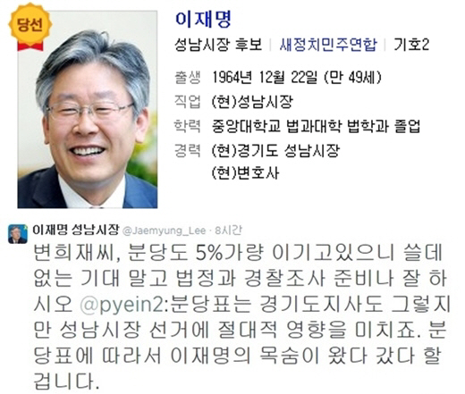 이재명 당선자는 5일 새벽 자신의 트위터 계정을 통해 "변희재씨, 분당도 5%가량 이기고 있으니 쓸데없는 기대 말고 법정과 경찰조사 준비나 잘 하시오"라는 글을 남겼다.