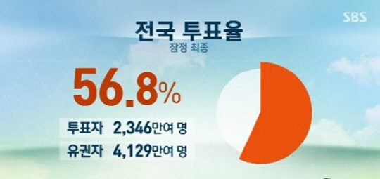 한편 지방선거 투표율 56.8%를 접한 네티즌들은 "투표율 56.8%, 60% 넘지 못해지만 선전한 듯", "투표율 56.8% 점차 오르는 추세니 다음을 기대해본다", "투표율 56.8%, 징검다리 휴일이라도 투표 했어야지", "투표율 56.8%, 투표결과에 더욱 관심 모여", "투표율 56.8%, 제일 낮은 투표율 지역은?"등의 반응을 보이고 있다. <스포츠조선닷컴>