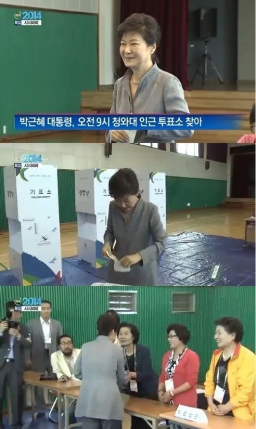 박근혜 대통령은 4일 오전 9시쯤 청와대 인근 서울 종로구 청운효자동 제1투표소를 찾아 투표를 행사한 후 각 정당 및 후보자 측 투표참관인들과 차례로 악수를 나눴다.