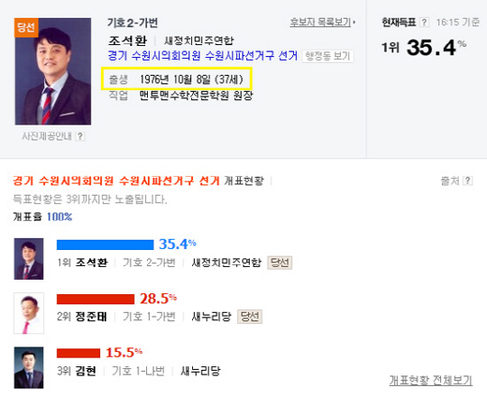 한편, 조석환 최연소 당선자 소식에 누리꾼들은 "조석환 최연소 당선자, 당선 축하해", "조석환 최연소 당선자, 젊은 일꾼", "조석환 최연소 당선자, 젊은 만큼 행동으로 잘 옮기길", "조석환 최연소 당선자, 앞으로 기대돼" 등의 반응을 보이고 있다. <스포츠조선닷컴>