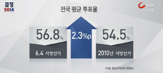 중앙선거관리위원회는 4일 6.4 지방선거 투표 집계 결과 "전체 유권자 4129만6228명 가운데 2346만4573명이 투표에 참가해 4년 전에 비해 2.3% 포인트 높은 56.8%로 잠정 집계됐다"고 밝혔다.