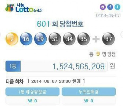 로또 601회 당첨번호 추첨결과 1등 당첨번호는 '2, 16, 19, 31, 34, 35', 2등 보너스 번호는 37이 뽑혔다.