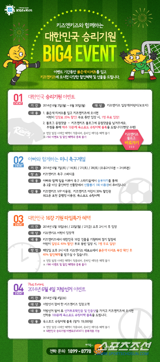 브라질 월드컵 대한민국 대표팀의 16강 진출을 응원하기 위해 준비한 '대한민국 승리기원' 특별 이벤트에 대한 더욱 자세한 사항은 키즈앤키즈 홈페이지(www.kidsnkeys.co.kr)를 통해 확인할 수 있다.