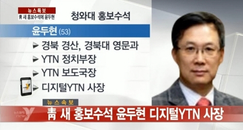 민 대변인은 이날 "윤 신임 수석은 YTN 정치부장과 보도국장 등 오랜 언론인 생활을 통해 균형감 있는 사고와 날카로운 분석 능력을 발휘해온 분"이라며 "정부가 추진하는 국가개조 작업에 대한 정부 정책을 설명하고 국민의 이해와 협조를 구하는 소통의 적임자로 판단해 임명했다"고 설명했다.