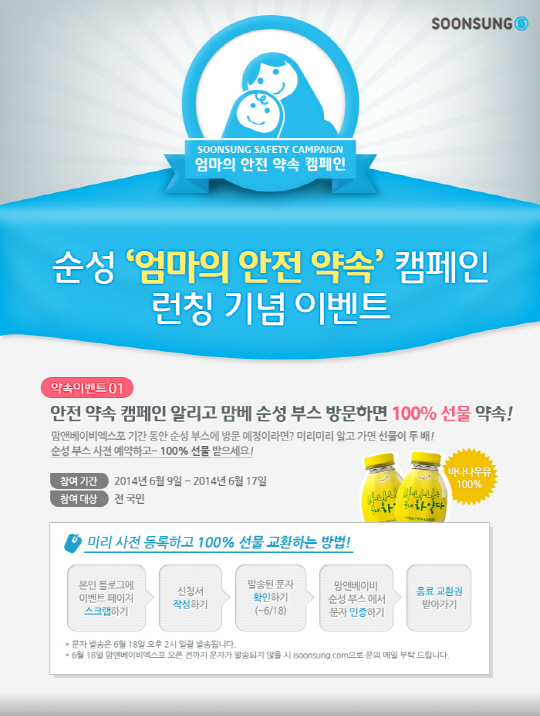 이번 캠페인은 19일 일산 킨텍스에서 개최하는 맘앤베이비 엑스포(이하, 맘베) 순성 부스(제1전시장, L1)에서 론칭 행사를 진행한다. 이를 기념해 오는 9일부터 17일까지 무료 음료 교환권을 증정하는 사전 이벤트를 진행한다.