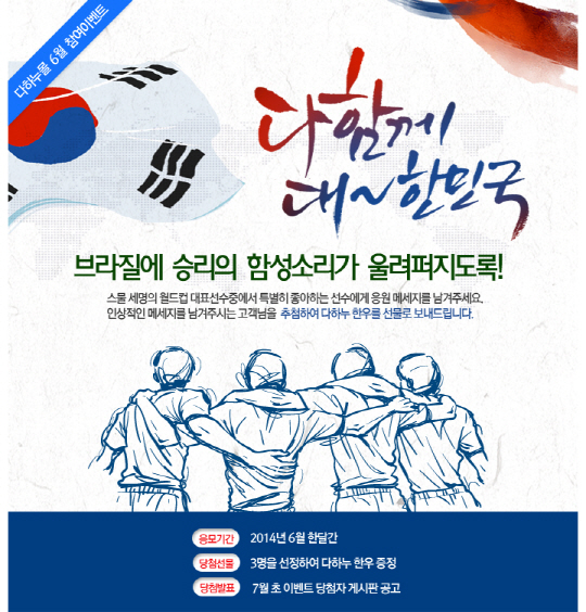 한우전문쇼핑몰 다하누몰(www.dahanoomall.com 대표 최계경)에서는 다가오는 2014년 브라질 월드컵을 맞아 '다함께 대~한민국' 고객 참여 댓글 이벤트를 준비했다.