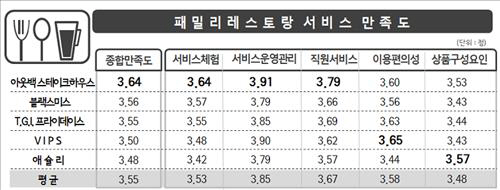 이같은 사실은 한국소비자원이 지난 4월 성인 1000명을 대상으로 5대 패밀리 레스토랑에 대한 서비스 만족도를 설문 조사한 결과 확인됐다.