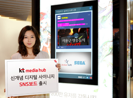 KT미디어허브(www.ktmediahub.com)가 디지털 사이니지에 SNS(소셜네트워크서비스) 기능을 접목한 신개념 광고 서비스 'SNS 보드'를 출시했다고 10일 밝혔다.