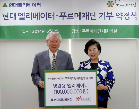 이날 현대엘리베이터는 푸르메재단과 기부 약정을 체결하고 2015년 준공 예정인 푸르메어린이재활병원(서울 마포구 상암동)에 설치될 병원용 엘리베이터를 기부했다.