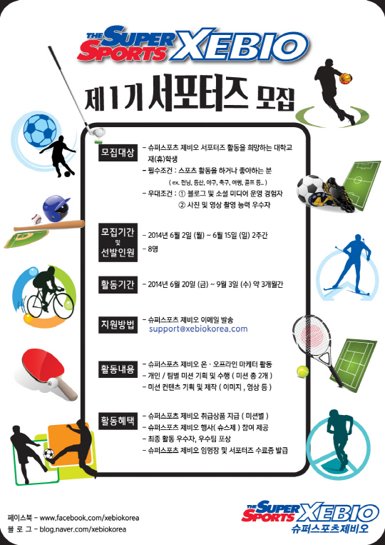 '슈퍼스포츠제비오 서포터즈 1기' 지원 대상은 런닝, 등산, 야구, 축구, 여행, 골프 등 스포츠를 좋아하는 대학생 및 대학원생(재·휴학생 포함) 누구나 지원 가능하다. 모집기간은 이달 15일까지로 모집 인원은 총 8명이다. 서포터즈 활동 기간은 6월 20일부터 9월 3일까지 약 3개월간이다. 제비오코리아는 평소 스포츠활동을 좋아하고 소셜네트워크서비스 기반으로 활동하는 사람을 우대해 선별할 예정이다.