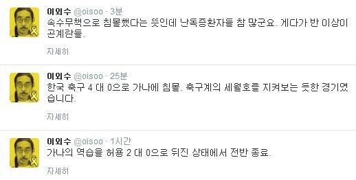 한국 축구 국가대표팀이 평가전에서 가나에게 0-4로 완패한 가운데, 소설가 이외수가 이를 세월호 참사에 빗대 구설에 올랐다.