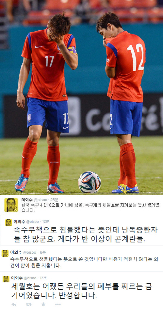 가나전 한국 축구 참패에 잇따른 이외수의 사과에 네티즌은 "가나전 한국 축구 참패에 잇따른 이외수의 사과, 너무했어", "가나전 한국 축구 참패에 잇따른 이외수의 사과, 세월호의 아픔이 채가시지도 않았는데...", "가나전 한국 축구 참패에 잇따른 이외수의 사과, 논란이 될걸 예상못했나"등의 반응을 보였다.