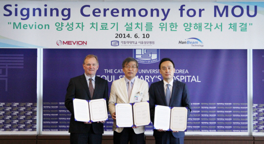 10일 오후 1시 병원 본관 21층 VIP회의실에서 서울성모병원 승기배 병원장, 전후근 암병원장, 미국 메비온사 조셉 자크노프스키 대표, (주)한빔 배성용 대표 등 각 기관 대표자들이 참석한 가운데 병원의 양성자 치료기 설치 준비를 위한 3자간 MOU를 체결했다.