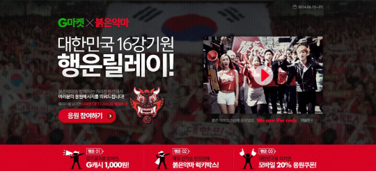 G마켓은 12일부터 27일까지 16일간 랜덤 선물이 들어있는 '럭키박스'를 6900원에 판매한다. 평일 매일 오전 10시부터 250개 한정수량으로 선착순 판매 한다. 사은품인 붉은악마 공식 응원앨범, G마켓 기프트 카드(5000원)를 기본 구성으로 아이패드 미니2(16G), SK2 클리어 로션세트, 월드컵 공식티셔츠, G마켓 기프트카드(1만원권), 응원 간식 중 한 가지를 랜덤으로 추가 제공한다. 같은 기간 'G마켓X붉은악마, 대한민국 16강 기원 행운릴레이'도 진행한다. 18일과 23일, 27일에 열리는 대한민국 대표팀의 경기에서 예상 경기 결과를 입력해 맞힌 고객 누구나 G캐시 1000원을 받을 수 있다. 경기 결과와 상관없이 해당 이벤트에 참여한 고객 매일 선착순 1만명에게는 G캐시 100원을 증정한다.