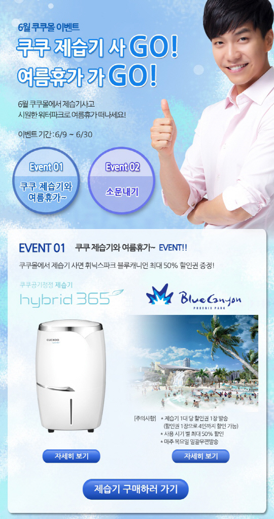 이번 행사는 공식쇼핑몰인 쿠쿠몰에서 공기청정 제습기 '하이브리드 365'를 구매하는 고객에게 휘닉스파크 블루캐니언 최대 50% 할인권을 제공한다. 제습기 1대당 할인권 1장을 증정하며 4인까지 할인 혜택을 받을 수 있다. 구매 후 매주 목요일에 우편으로 일괄 방송할 예정이다.