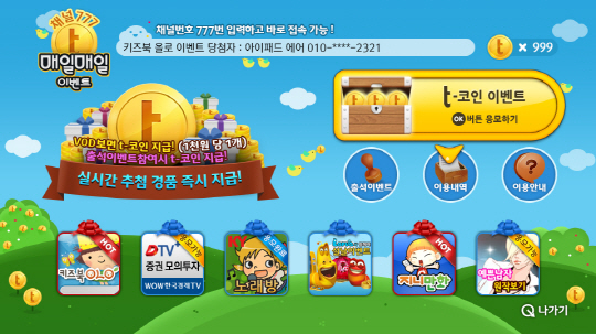 t-코인은 기존에 VOD를 시청했을 땐 없었던 보너스로, VOD 구매시 이벤트에 응모할 수 있는 t-코인이 1000원 당 1개씩 지급된다. 1일차, 4일차, 7일차 출석이벤트를 통해서도 t-코인을 1개씩 받을 수 있다. t-코인으로 최대 1만원까지 무료로 VOD를 볼 수 있는 쿠폰을 응모 즉시 추첨해서 지급하는 이벤트에 참여할 수 있다.