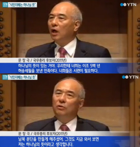 당시 문 후보자는 "하나님은 왜 이 나라를 일본의 식민지로 만들었습니까, 라고 우리가 항의할 수 있겠지, 속으로. 하나님의 뜻이 있는 거야. 우리한테 너희들은 이조 5백 년 허송세월을 보낸 민족이다. 너희들은 시련이 필요하다. 남북 분단을 만들게 해주셨어. 그것도 지금 와서 보면 저는 하나님의 뜻이라고 본다"고 말했다.