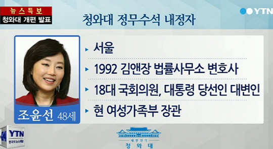 조윤선 정무수석 내정자는 지난 2002년 대선에서 한나라당(현 새누리당) 이회창 후보의 눈에 띄어 정계에 입문했으며, 제18대 총선에는 비례대표로 국회의원 배지를 달았다. 이후 새누리당에서 2년 가까이(665일) 대변인을 맡으며 이 분야 당내 최장수 기록을 세우기도 했다.