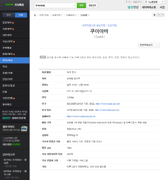 이번에 구축된 '세계지명사전'은 브라질 월드컵에서 한국 대표팀의 경기가 개최되는 '쿠이아바', '포르투알레그리', '상파울루' 등 브라질 주요 도시를 포함한 남아메리카 주요 지역의 정보들이 제공된다.네이버 지식백과에서 브라질 월드컵의 한국 대표팀 첫 경기가 열리는 '쿠이아바'를 검색하면 '쿠이아바'의 위치 및 인구 등 지역 정보뿐 아니라 해당 도시의 역사, 경제, 문화, 교육 등 다양한 분야의 상세정보도 확인할 수 있다.