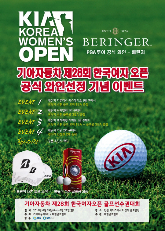 롯데주류(www.lotteliquor.com)가 '기아자동차 제28회 한국여자오픈 골프선수권대회' 공식 와인인 '베린저' 구매 고객을 대상으로 16일부터 골프대회 초대권과 골프용품을 증정하는 이벤트를 개최한다.