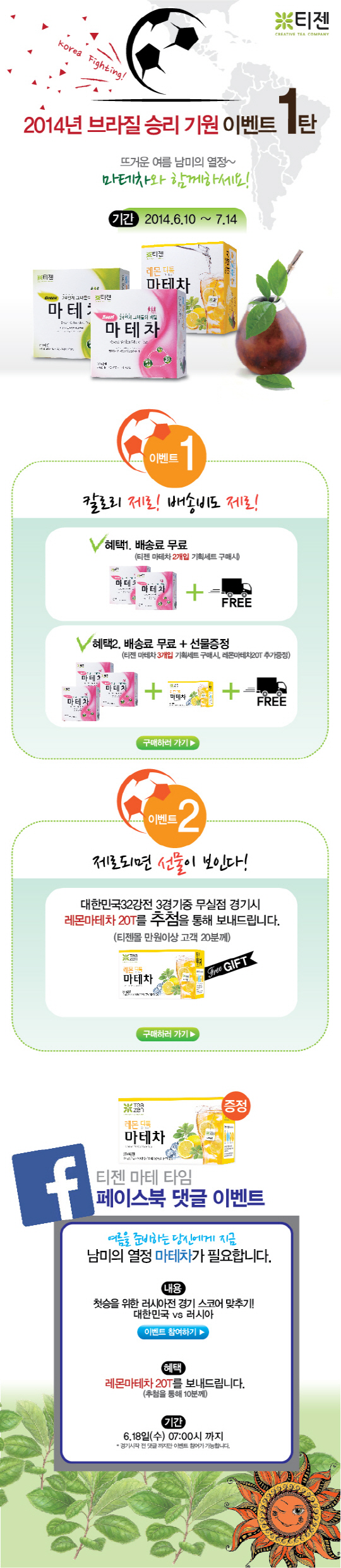 티젠 마케팅팀은 "남미의 열정을 담은 마테차를 활용한 다양한 이벤트를 기획했다"며 "대한민국 승리 기원과 다이어트에 관심이 높은 여성 고객들이 원기회복과 다이어트에 좋은 시원한 마테차를 마시며 건강한 응원을 즐기는 축제 시즌이 되길 바란다"고 말했다.