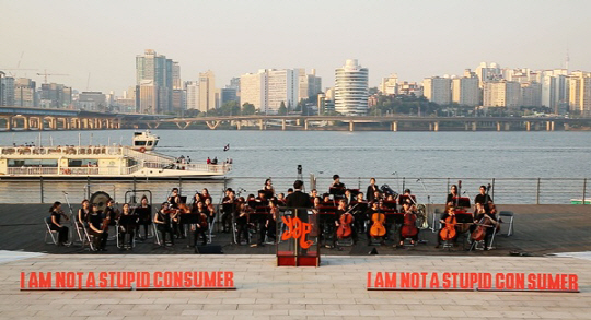 지난 일요일 여의도 한강공원, 세종문화회관에서나 봄직한 40명의 심포니 오케스트라가 도열하고 있었고, 그 옆엔 오케스트라와 어울리지 않게 뻥튀기 기계 여러 대가 놓여 있었다. 공원을 걷던 시민들이 호기심을 갖고 오케스트라 앞으로 모이자 공연은 시작됐다.