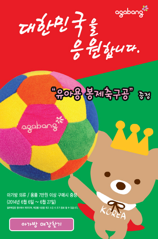 아기옷 전문 브랜드 아가방은 27일까지 전국의 아가방 매장에서 7만원 이상 제품 구입 고객에게 '유아용 봉제 축구공'을 증정한다.