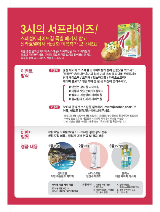 켈로그 저칼로리 감자칩 '스페셜K 라이트칩'이 오는 22일까지 '라이트칩 SNS 인증샷 이벤트'를 진행한다.