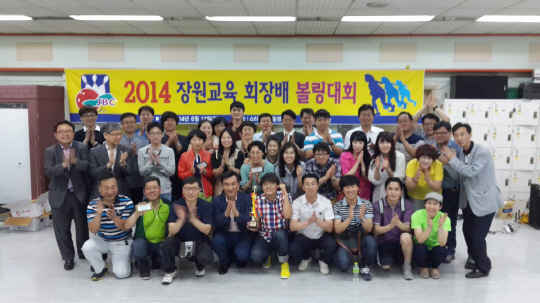 종합교육기업 ㈜장원교육(대표 문규식, 앞줄 왼쪽 4번 째)이 여름철을 맞아펀(funn)경영을 위해 개최한 '2014 장원교육 회장 배 볼링대회'에서 결선에 올라온 각 부서 선수들이 시상식 후 파이팅을 외치고 있다.