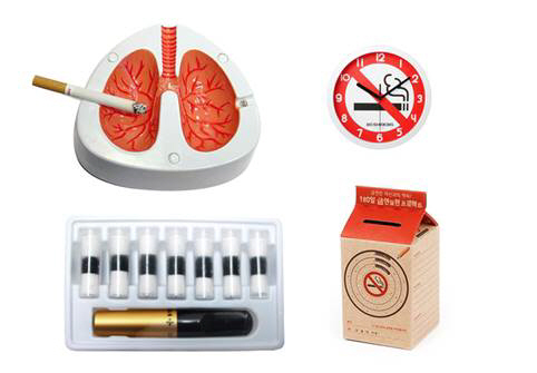 금연 관련 이색제품도 다양하게 등장했다. G마켓에서 판매하는 '기침하는 재떨이'(5370원)는 폐 모형에 열 감지 센서가 내장돼 재를 털 때마다 기침소리를 낸다. 금연에 대한 경각심을 일깨워 금연 도우미로 인기다. 비슷한 아이디어 재떨이로는 담배를 털 때마다 무덤이 보이는 '무덤 재떨이'(3670원), '공동묘지 재떨이'(6200원) 등이 있다.