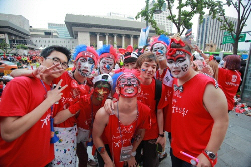 서울종합예술학교(이사장 김민성)가 2014브라질 월드컵 한국과 러시아전이 열린 18일 광화문광장에서 대규모 거리응원전을 펼쳤다. 광화문 광장에 모인 1만6000여명의 시민들과 함께 학교 학생 1200여명이 월드컵 응원 군무, 시민대상 무료 페이스페인팅 및 머핀 증정 등을 제공했다.