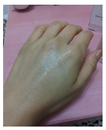 꼬달리 래디언스 세럼은 뚜껑에 스포이드가 달려있어 접촉에 의한 오염 등을 막아준다. 사진은 스포이드를 이용해 세럼을 손 등에 살짝 뿌려준 모습.