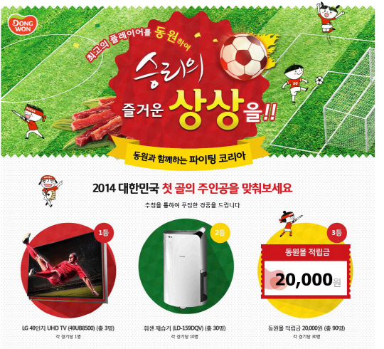 '대한민국 첫 골 주인공 맞히기'는 일부 제품을 제외한 동원F&B 제품을 15,000원 이상 구매한 고객을 대상으로 한다. 정답을 맞힌 고객 중 추첨을 통해 경기당 1명에게 LG 49인치 UHD TV를 증정하며 경기당 10명에게는 휘센 제습기를, 경기당 30명에게 동원몰 적립금 2만원 상품권을 증정한다. 알제리전 이벤트는 22일(일) 23시59분까지 참여할 수 있으며, 벨기에전 이벤트는 26일(목) 23시59분까지 참여할 수 있다.