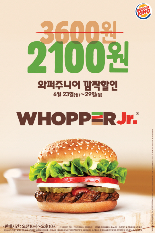 고객은 이벤트 기간 동안 '와퍼주니어' 단품을 기존 가격 3600원에서 40% 할인된 2100원에 구입할 수 있다.