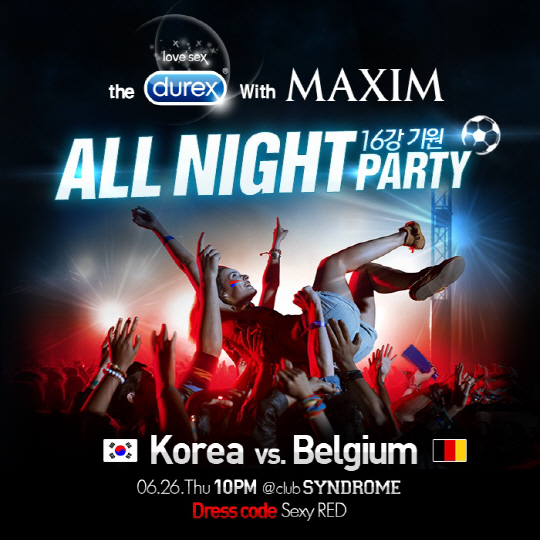 전세계 판매 1위 콘돔 브랜드 듀렉스와 남성매거진 맥심, 예거마이스터가 함께 하는 이번 파티는 벨기에와 맞서는 대표팀을 함께 응원하며 축제를 색다르고 신나게 즐기자는 취지에서 기획됐다. 대한민국-벨기에 경기 전날인 26일 밤 10시부터 경기가 끝나는 다음 날 아침까지 진행되며, 성인이면 오전 1시까지 누구나 무료 입장할 수 있다.