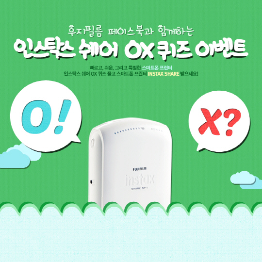 한국후지필름(대표 이덕우, www.fujifilm.co.kr)이 페이스북에서 '인스탁스 쉐어 OX퀴즈 이벤트'를 7월 18일까지 진행한다.
