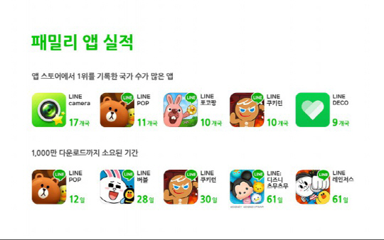 패밀리앱은 라인과의 연동을 통해 친구들과 함께 즐길 수 있어 특히 젊은 층의 호응을 얻었다. 라인 외에도 14개 앱이 1천만 다운로드 이상을 기록했으며 개별 앱으로는 '라인 카메라'가 9천만으로 가장 많은 다운로드 수를 기록했다. '라인 게임'에서는 4천 3백만 이상의 다운로드를 기록한 '라인 팝'을 포함, 총 9개 타이틀이 1천만 다운로드를 돌파하며 전세계 이용자들의 사랑을 받고 있다.