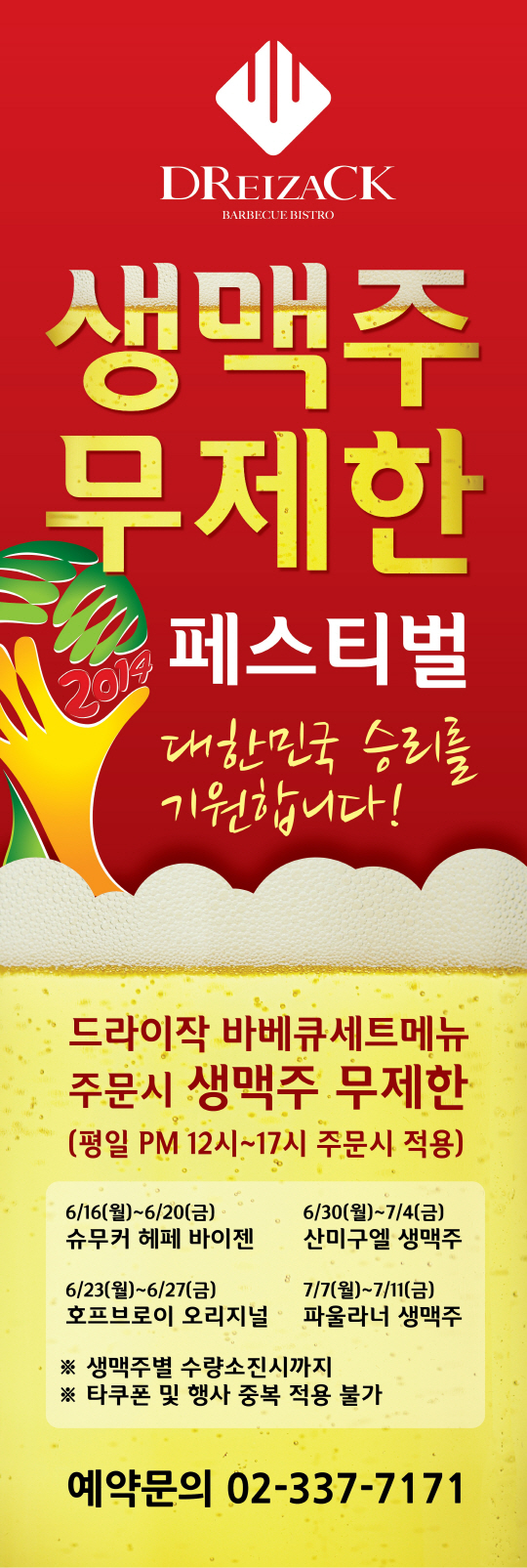 유러피안 바비큐 레스토랑 드라이작(dreizack)이 월드컵 16강 기원을 위한 맥주 페스티벌을 오는 7월 11일까지 진행한다. 6월 26일까지 16강 진출여부 OX퀴즈이벤트를 진행하며 맞춘 고객 전원에게 세계생맥주 호프브로이 한잔을 제공한다. 7월 11일까지 평일 17시 전에 바비큐 세트메뉴를 주문할 경우 세계 생맥주가 무제한 무료 제공된다. 이벤트로 무료 제공되는 세계생맥주는 슈무커, 호프브로이, 산미구엘, 파울라너 등이다.