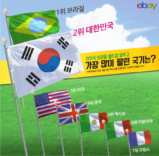 이베이는 브라질월드컵을 맞아 최근 3개월(3월1일~5월23일)간 한국, 미국, 캐나다, 영국, 브라질, 스페인 등 13개 국기 판매량을 분석해봤다.