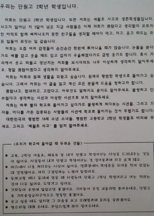 지난 22일 단원고 생존 학생들은 '우리는 단원고 2학년 학생입니다'라는 제목으로 A4 1장짜리 글을 통해 학교 복귀에 대한 두려움과 국민들에 대한 부탁의 메시지를 전했다.