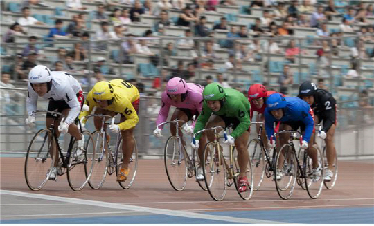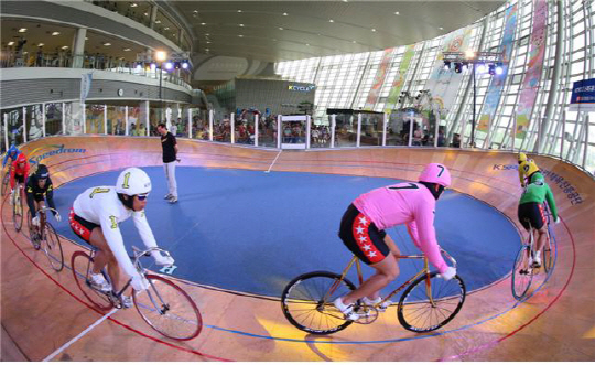 지난 22일 광명스피돔에서는 미니밸로드롬 '스피드롬'의 오프닝대회가 열렸다. 스피드롬은 광명스피돔을 1/10로 축소한 크기로 국내에서 첫 선을 뵈는 초소형 사이클 경기장이다. 대회에 앞서 경륜선수들이 시범레이스를 펼치고 있다.