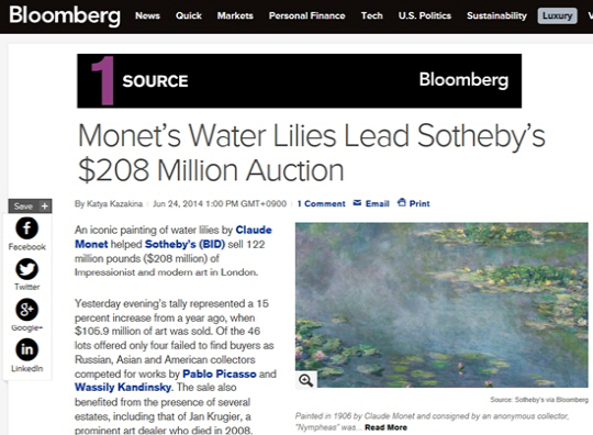 프랑스 인상주의 화가 클로드 모네의 1906년 작 '수련'(Nympheas)이 23일(현지시각) 런던 소더비 경매에서 5천400만 달러(약 550억 원)에 팔렸다.