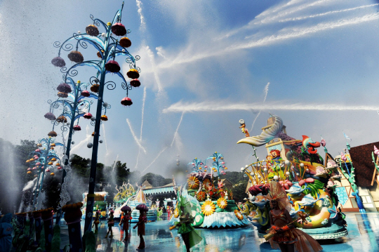 align='left" bgcolor='#ffffff" class='caption'>주요 테마파크에서는 끈적한 더위를 날릴 수 있는 호쾌한 여름이벤트를 실시하고 있다. 사진은 에버랜드 의 여름축제 '스플래쉬 퍼레이드'