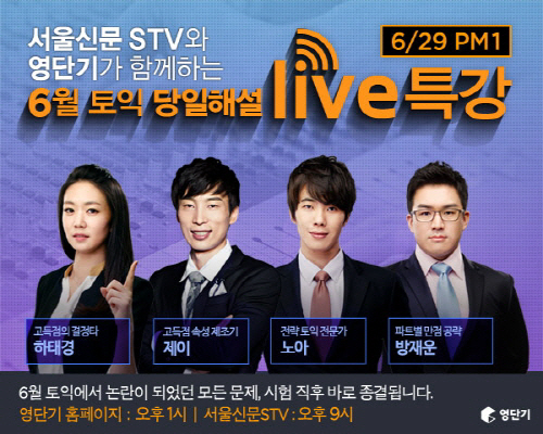 에스티앤컴퍼니의 영단기(영어단기학교)는 6월 정기 토익시험 당일인 29일(일) 오후 1시, 영단기 홈페이지에서 '서울신문STV와 함께하는 6월 토익 당일 해설 라이브 특강'을 진행한다.
