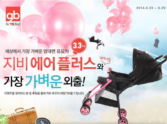 YKBnC의 지비 브랜드 마케팅 담당자는 "자녀와 외출이 많은 엄마에게는 '사용하기 편한 휴대용 유모차'보다 '가볍고 사용하기 편한 휴대용 유모차'가 외출 시 절대적으로 필요하다"며 "지비 에어 플러스는 국내에 출시 된 흔한 휴대용 유모차가 아닌 '가장 가벼운 3.3㎏무게'와 '유일하게 양대면이 가능한 초경량 휴대용 유모차'이다. 더운 여름 자녀와 가볍고 즐거운 여름 외출을 즐길 수 있도록 이번 이벤트를 기획하게 되었다"고 전했다.