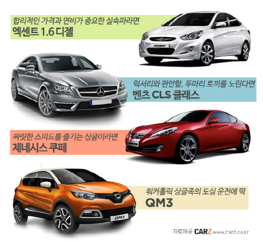 실용성과 디자인, 경제성 등 어느 것 하나 놓칠 수 없는 깐깐한 싱글족에게 적합하다. 17.6㎞/ℓ라는 도심주행연비로 국산차 부문 1위를 차지한 모델인만큼, 매일 반복되는 출퇴근길 기름값 부담을 덜 수 있다. SUV의 단단함을 가지고 있으면서도 몸집이 그리 크지 않은 콤팩트한 디자인 역시 유니크하다. 부드러운 주행감 또한 특징. 시내 곳곳에 자리잡은 과속방지 카메라를 피할 수 있는 스피드리미터, 약한 압력에도 확실히 제동이 가능한 브레이크 보조시스템 등 도심 운전에 유용한 기본 옵션도 주목할만하다. 다만 신차이기 때문에 중고 물량은 많지 않다. 2013년식 모델의 경우 2300만~3200만원대다.