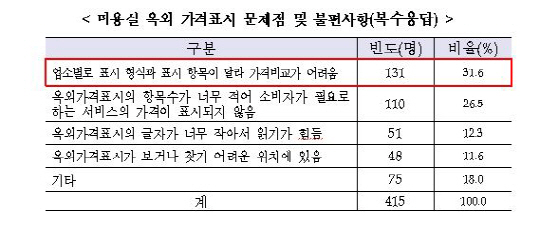 한편 최근 미용실을 이용한 여성 소비자 500명을 대상으로 현행 옥외가격표시제에 대해 설문 조사를 한 결과 466명(93.2%)이 옥외가격표시가 필요하다고 응답했고, 440명(88.0%)이 '잘 이행되고 있지 않다'고 인식하는 것으로 나타났다.