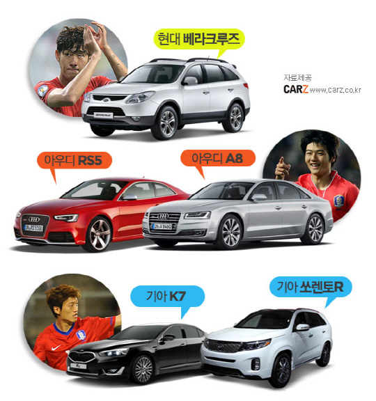 2014브라질월드컵의 열기가 고조되고 있는 가운데 태극전사들의 자동차가 화제로 떠올랐다.